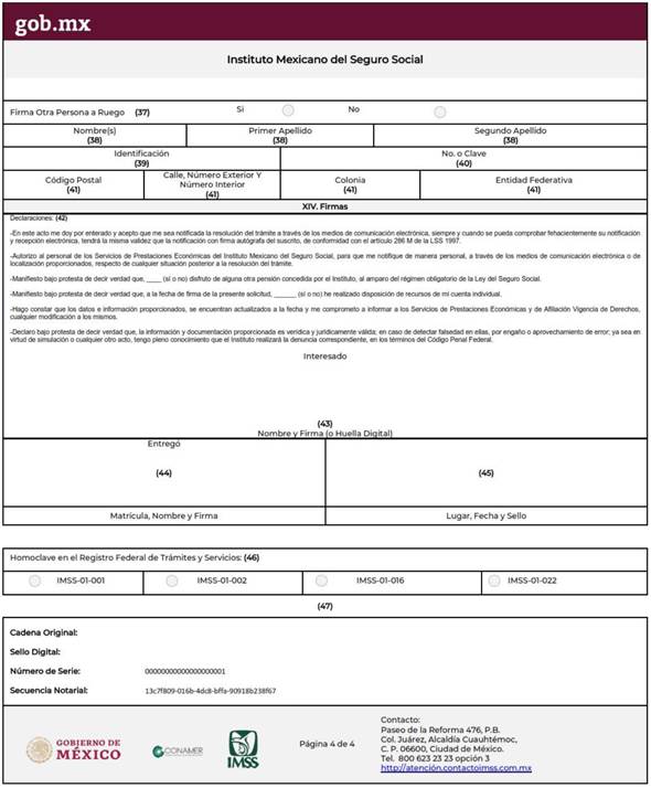 Los trámites de: A) Solicitud de pensión de incapacidad permanente; B) Solicitud de pensión de invalidez; C) Solicitud de pensión de cesantía en edad avanzada o vejez; y E) Solicitud de pensión de retiro, cesantía en edad avanzada o vejez a través de transferencia de derechos IMSS-ISSSTE, se realizarán a través de los formatos específicos que emita el aplicativo “Mi Pensión Digital”, mismos que al momento de su emisión, su autenticidad estará validada a través de la “Cadena Original” y “Sello Digital”.