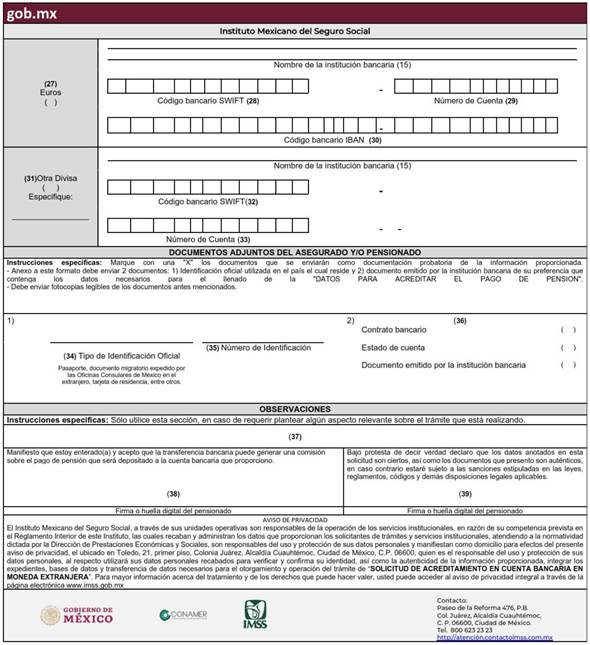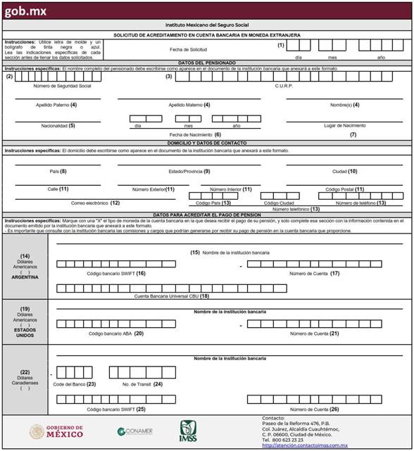 Cuando la persona pensionada traslade su domicilio al extranjero y decida que el pago de su pensión se realice a través de una institución bancaria extranjera ubicada en el país de su residencia, podrá solicitar que el Instituto realice el depósito correspondiente, cuyos gastos administrativos de traslado de los fondos correrán por cuenta del pensionado. En este caso, el pensionado deberá informar al Instituto el número de cuenta (CLABE) o su equivalente, código internacional, localidad, sucursal e Institución de Crédito con la que apertura la nueva cuenta a su nombre para recibir el pago de la pensión, de acuerdo con la disponibilidad del servicio que para dichas transferencias determine el Instituto.