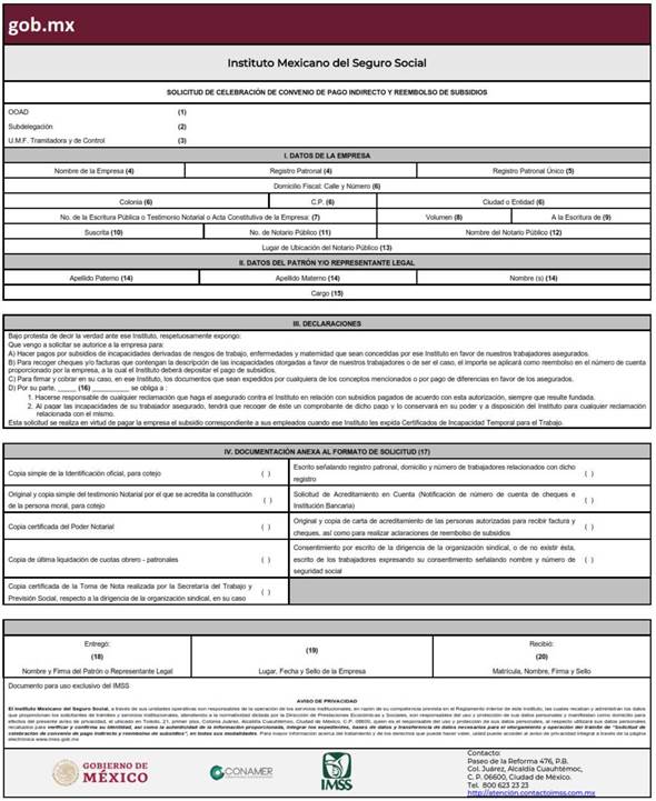 Solicitud de celebración de convenio de pago indirecto y reembolso de subsidios. |