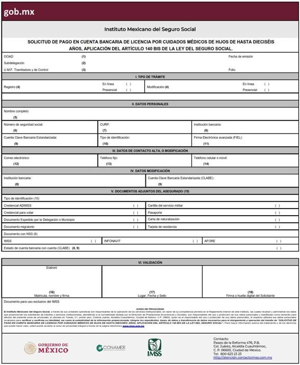 Solicitud de pago en cuenta bancaria de licencia por cuidados médicos de hijos de hasta dieciséis años, aplicación del artículo 140 Bis de la Ley del Seguro Social. |