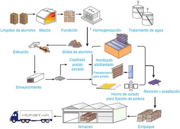 10. El principal insumo para la producción de perfiles huecos es el aluminio, además de energéticos —electricidad— y mano de obra. El proceso productivo para fabricar perfiles huecos de aluminio es básicamente el mismo en todo el mundo, debido a que son commodities, y en general consta de dos etapas: