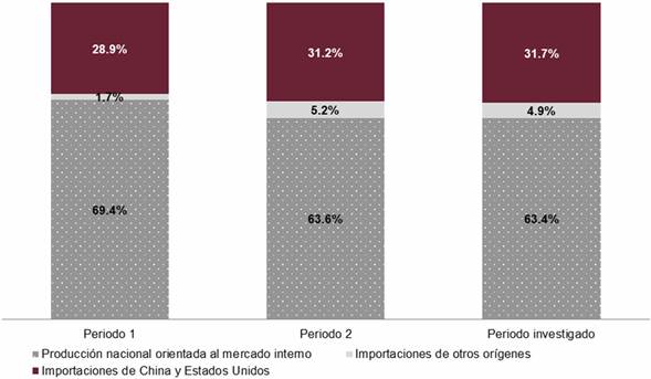 424. En este contexto de crecimiento de la demanda nacional de perfiles huecos de aluminio, la PNOMI perdió 6.0 puntos porcentuales en el CNA al pasar de representar 69.4% en el periodo 1 a 63.4% en el periodo investigado, mientras que las importaciones de China y los Estados Unidos ganaron 2.8 puntos porcentuales al pasar de representar 28.9% en el periodo 1 a 31.7% en el periodo investigado, en tanto que las importaciones de otros orígenes ganaron 3.2 puntos porcentuales al pasar de representar 1.7% en el periodo 1 a 4.9% en el periodo investigado. Aunque la participación de mercado que ganaron las importaciones de otros orígenes fue mayor a la de las importaciones investigadas, en términos absolutos el volumen de estas últimas fue mayor más de 7 veces, por lo que se infiere que los efectos negativos en los indicadores de la rama de producción nacional, se relacionan con el incremento de las importaciones investigadas y sus precios.