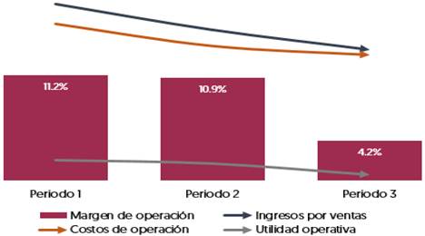 c. En consecuencia, el margen operativo bajó 0.3 puntos porcentuales en el periodo 2 y 6.7 puntos porcentuales en el periodo investigado, lo que reflejó una caída de 7 puntos porcentuales en el periodo analizado, al pasar de un margen operativo de 11.2% en el periodo 1 a 4.2% en el periodo investigado.