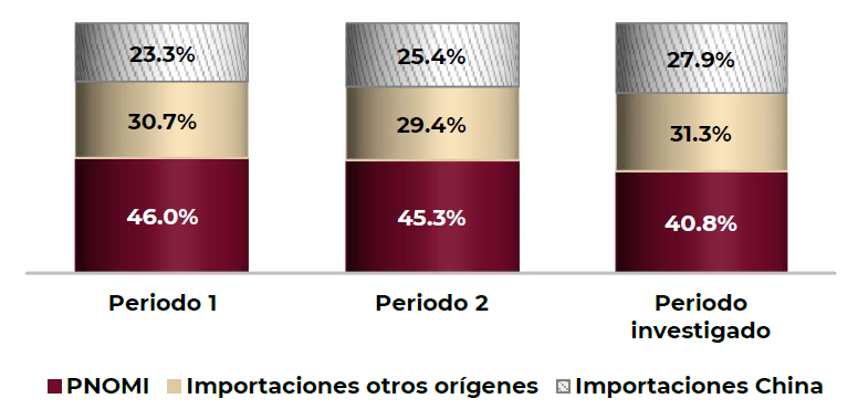 b. Las importaciones investigadas se incrementaron en términos absolutos y relativos. Durante el periodo analizado registraron un crecimiento de punta a punta de 61%: 29% del periodo 1 al periodo 2 y 25% en el periodo investigado respecto del anterior comparable, lo que les permitió incrementar su participación en las importaciones totales, al pasar de una contribución de 43% en el periodo 1 a 47% en el periodo investigado. En relación con el CNA, pasaron de 23.3% a 27.9%, lo que significó un aumento de 4.6 puntos porcentuales en el periodo analizado (2 puntos del periodo 1 al periodo 2 y 2.5 puntos en el periodo investigado).
