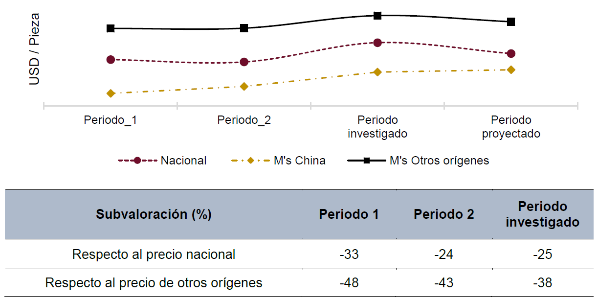 c. En el periodo analizado las importaciones originarias de China registraron precios inferiores a los de la rama de producción nacional, en porcentajes que fluctuaron entre 24% y 33% (25% en el periodo investigado), y también se ubicaron por debajo del precio de las importaciones de otros países (en porcentajes que fluctuaron entre 38% y 48%).