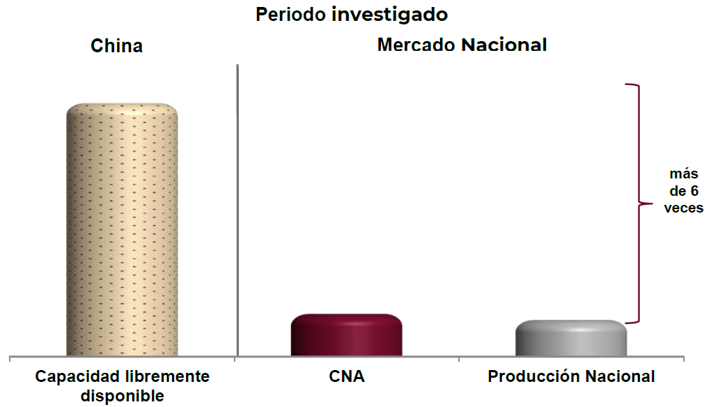 h. La información disponible indica que China cuenta con una capacidad libremente disponible mayor en relación con la producción nacional y el tamaño del mercado mexicano de la mercancía similar, lo que permite presumir que continuará orientando parte de sus exportaciones al mercado nacional.